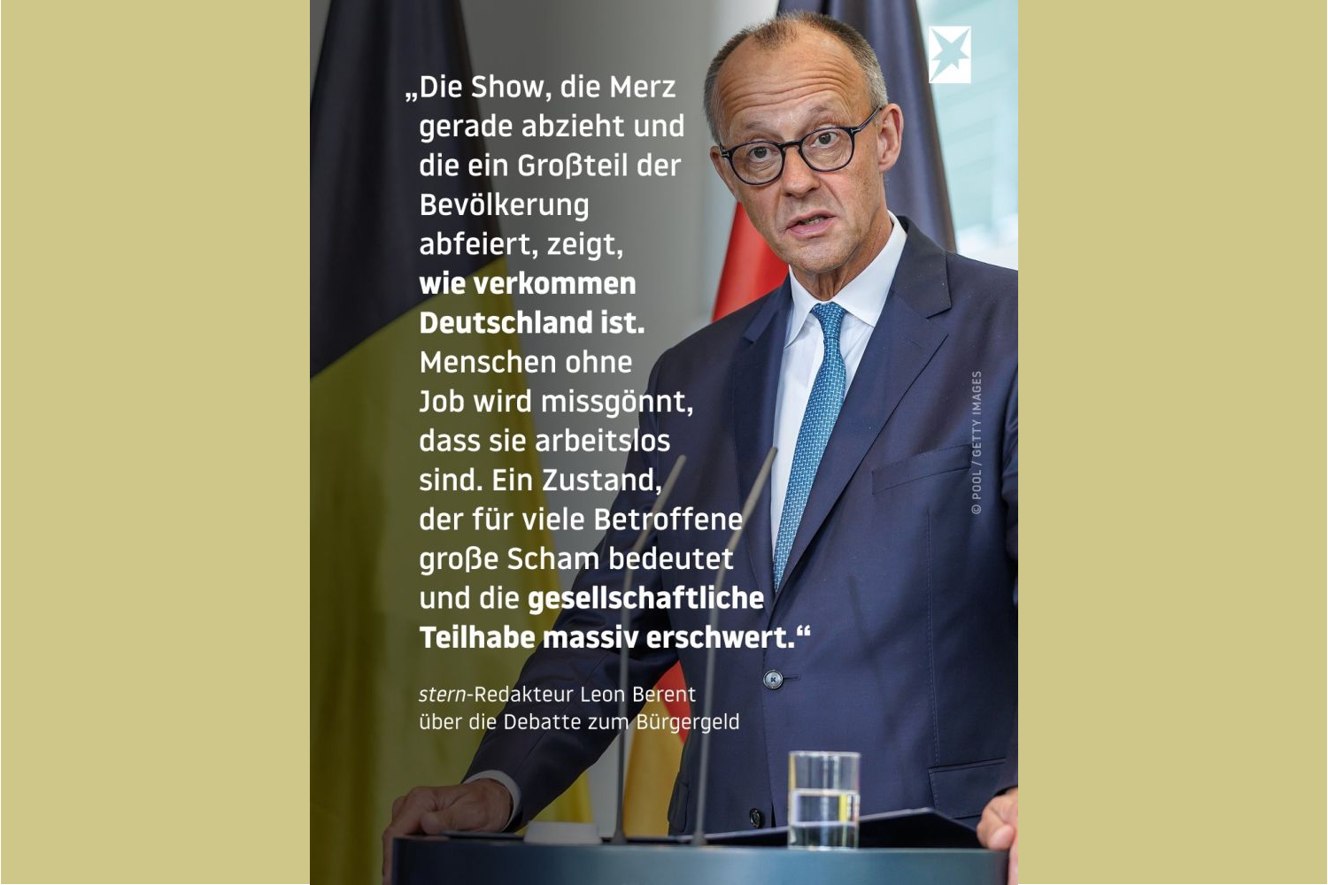 Friedrich Merz während einer Rede im Bundestag. Das begleitende Zitat kritisiert die aktuelle Debatte um das Bürgergeld als Ausdruck gesellschaftlicher Verrohung. Quelle: POOL / Getty Images